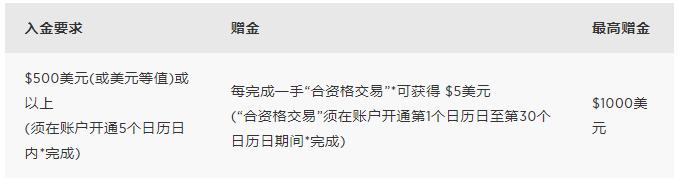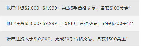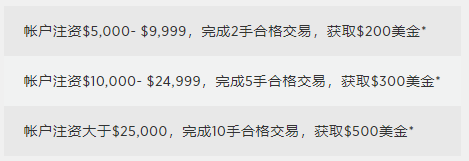 在嘉盛集团开设账户后5个日历日内*成功入金$500美元或以上,即可在账户开通30个日历日内从每手“合资格交易”获得 $5美元赠金*。