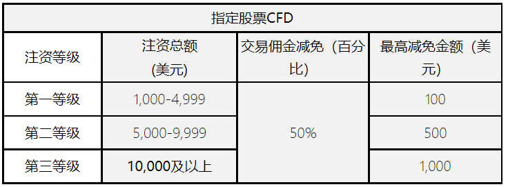 指定股票CFD 交易赠金活动: 客户可在2021年8月1日至2021年8月31日活动期间活动期间在其账户中交易指定股票CFD获得交易佣金减免 50%, 佣金减免金额最高为 $ 1000 美元。请留意每一注资等级有相应的最高减免金额 。